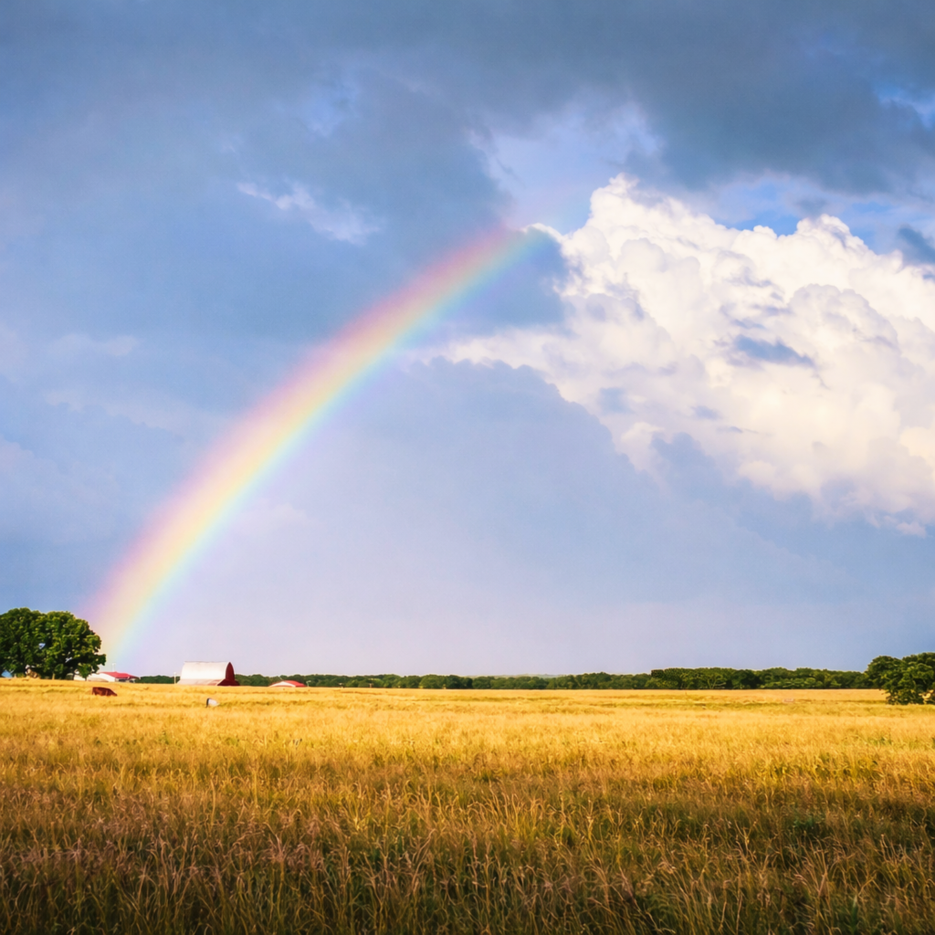 And one afternoon, after a storm passed through, a rainbow appeared over a wheat field. One of those full ones — both ends visible, arcing clean over a red barn and a tree line.